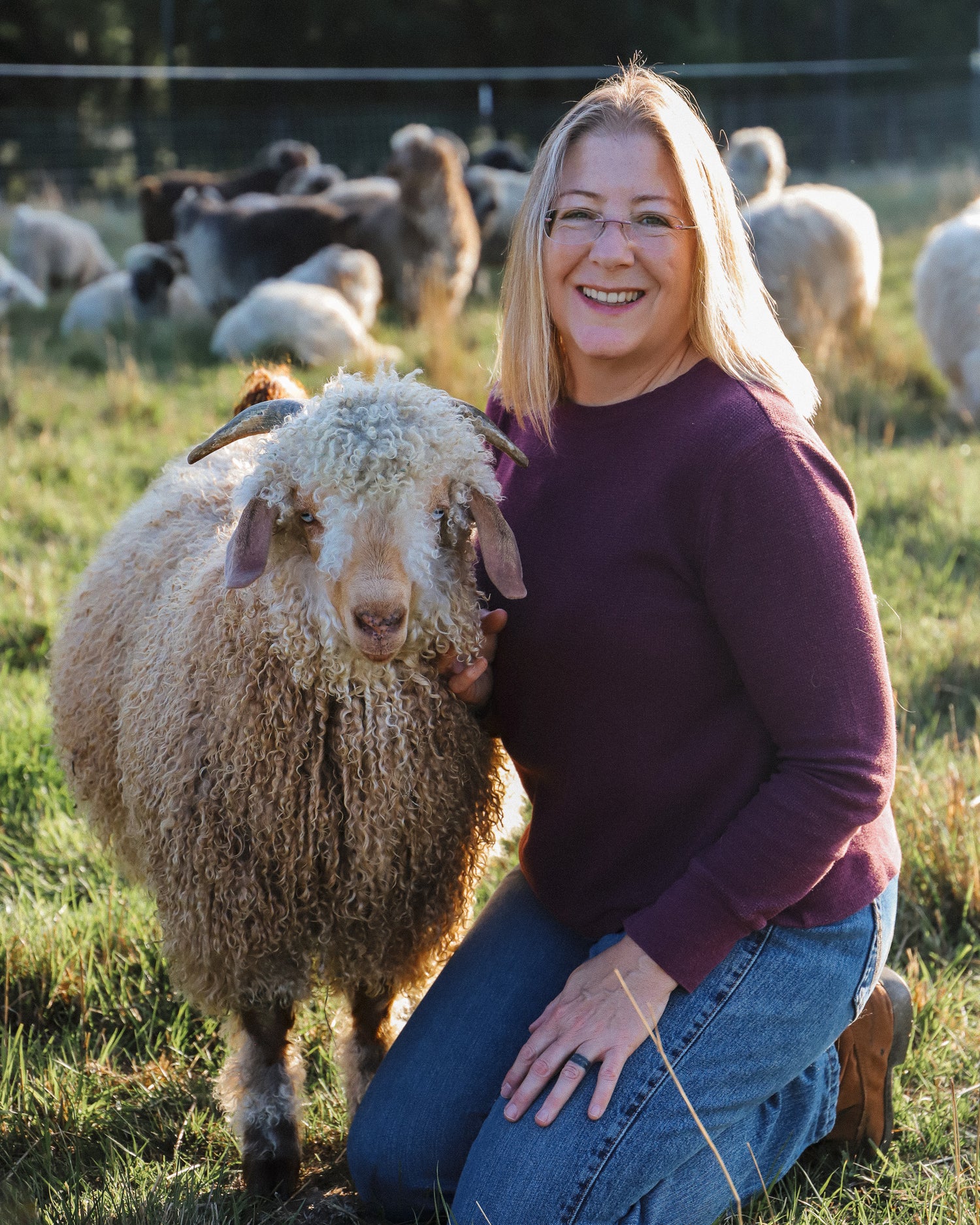 We raise our own herd of Angora goats on mountain pastures in Idaho, where they produce exceptionally silky, lustrous mohair. We blend this with domestic merino wool to create a naturally soft, breathable, and luxurious fabric.